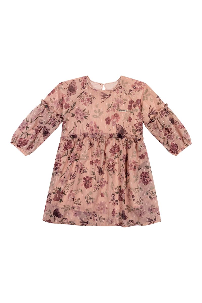 • Feito em chiffon com lurex • Mangas longas e cintura com frufrus • Fechamento em botão nas costas • Estampa floral • Ideal para ocasiões especiais, como festas