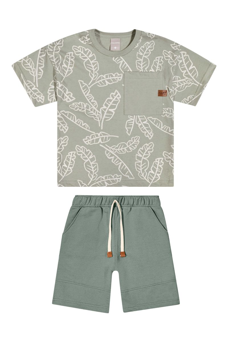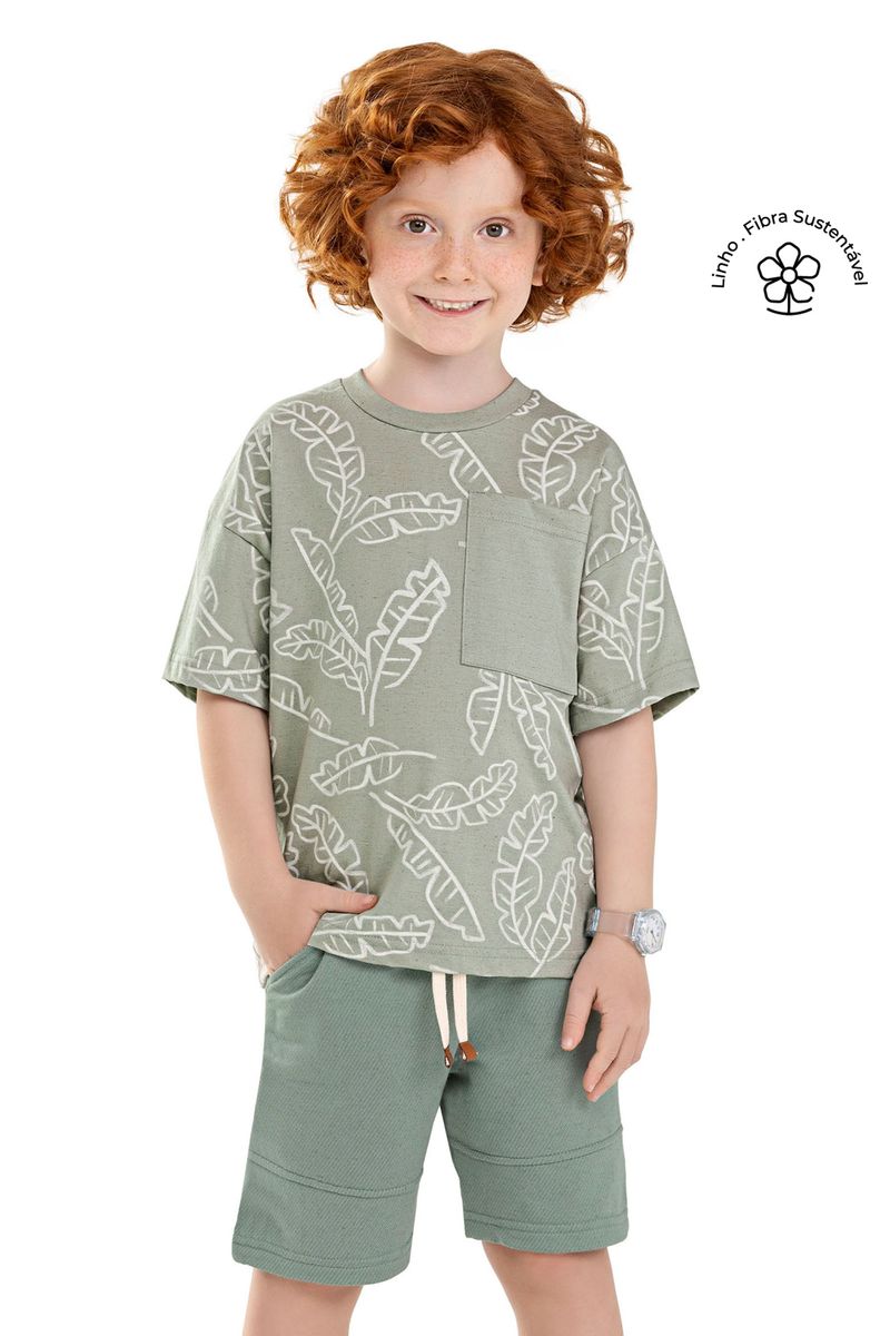 • Conjunto composto por camiseta e bermuda • Feito em malha linho estampada e moletom eco linho • Possui mangas curtas com ombros deslocados • Estampa tropical com folhas • Elástico no cós • Possui bolsos • Ideal para momentos de lazer