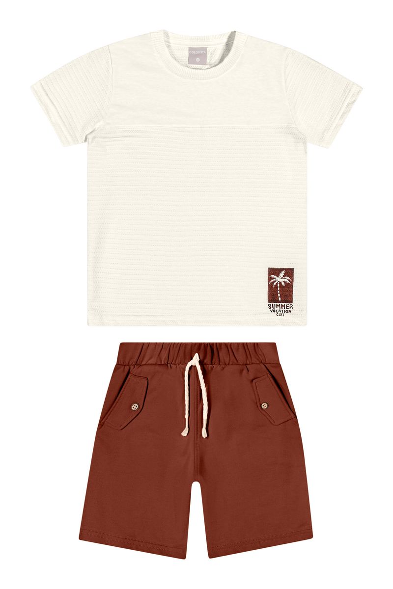 • Conjunto composto por camiseta e bermuda • Feito em malha texturizada, meia malha e moletinho • Possui mangas curtas • Estampa com temática tropical em relevo • Elástico no cós • Possui bolsos com detalhe em lapela • Ideal para passeios e momentos casuais