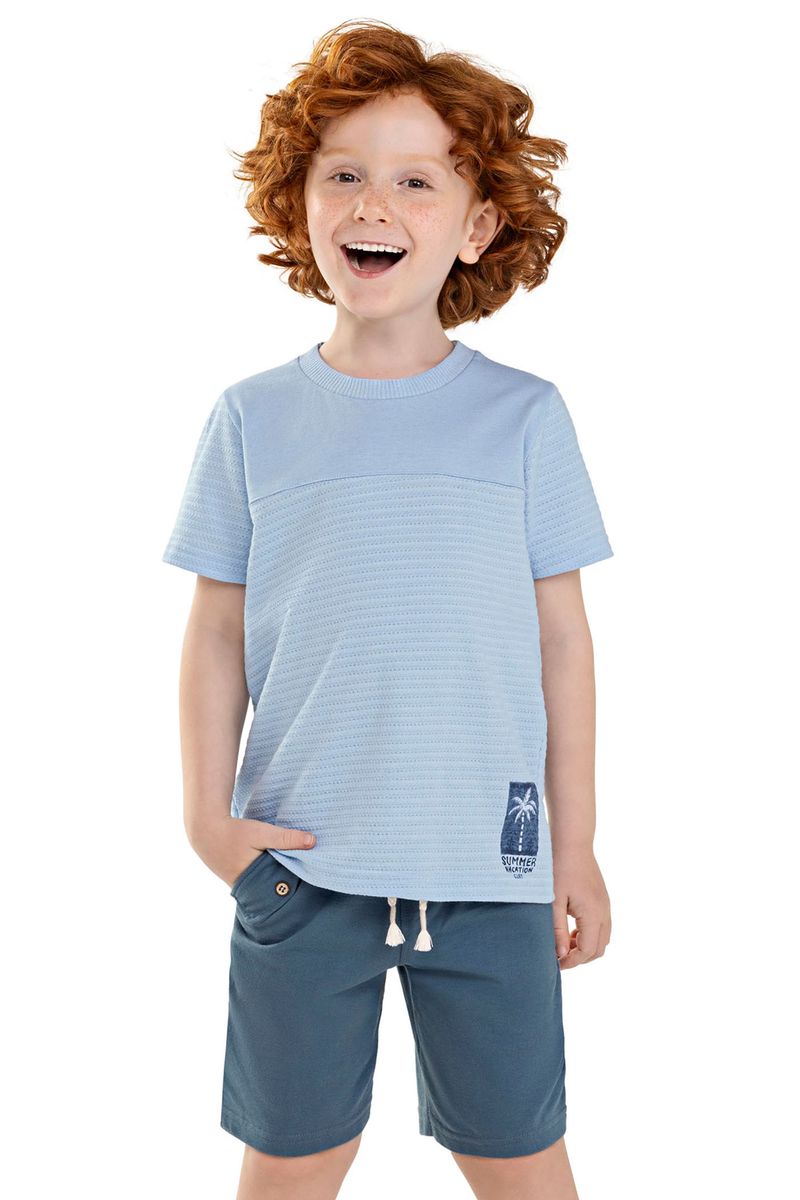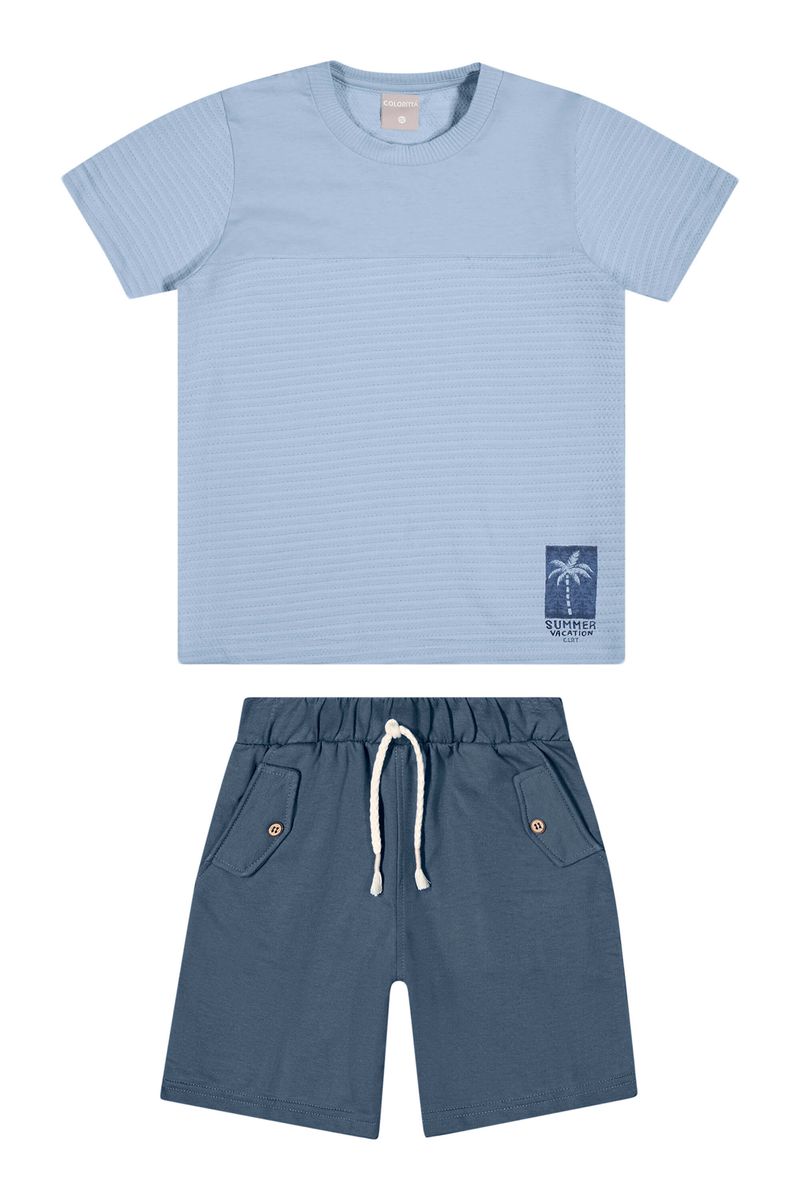 • Conjunto composto por camiseta e bermuda • Feito em malha texturizada, meia malha e moletinho • Possui mangas curtas • Estampa com temática tropical em relevo • Elástico no cós • Possui bolsos com detalhe em lapela • Ideal para passeios e momentos casuais