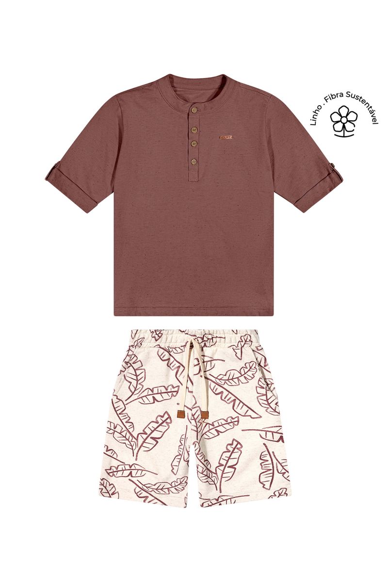 • Conjunto composto por camisa e bermuda • Feito em malha linho e moletom eco linho estampado • Possui gola padre com botões no peitilho • Possui mangas 3/4 • Elástico no cós • Possui bolsos • Estampa tropical com folhas • Ideal para passeios descontraídos ou eventos especiais