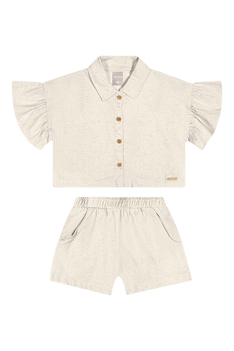 • Conjunto composto por camisa e short • Feito em tecido linho rústico • Possui mangas curtas amplas com babados • Abertura frontal em botões • Elástico no cós • Possui bolsos • Ideal para passeios ou encontros com a família e amigos