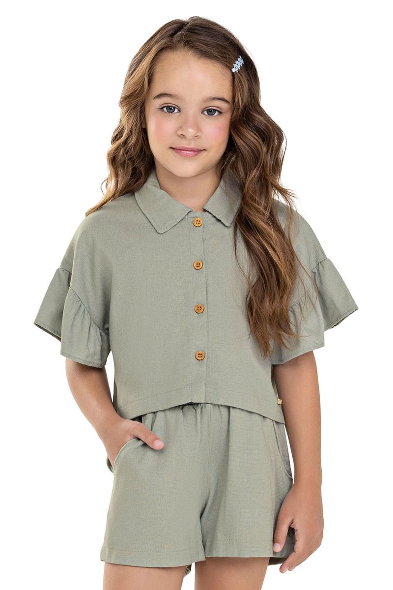 • Conjunto composto por camisa e short • Feito em tecido linho rústico • Possui mangas curtas amplas com babados • Abertura frontal em botões • Elástico no cós • Possui bolsos • Ideal para passeios ou encontros com a família e amigos