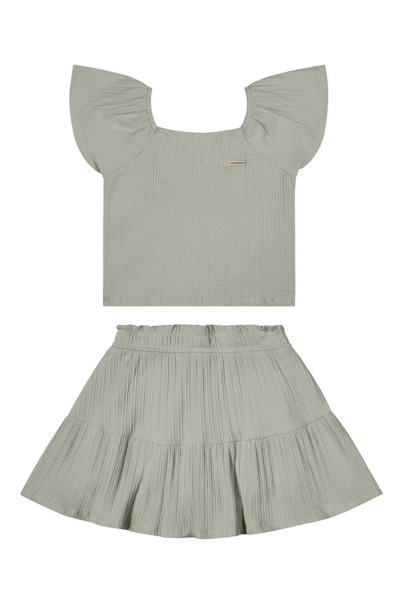 • Conjunto composto por blusa e saia • Feito em malha canelada trabalhada • Possui mangas curtas amplas com franzidos • Decote V com transpasse nas costas • Elástico no cós • Possui short interno • Ideal para ocasiões especiais ou passeios