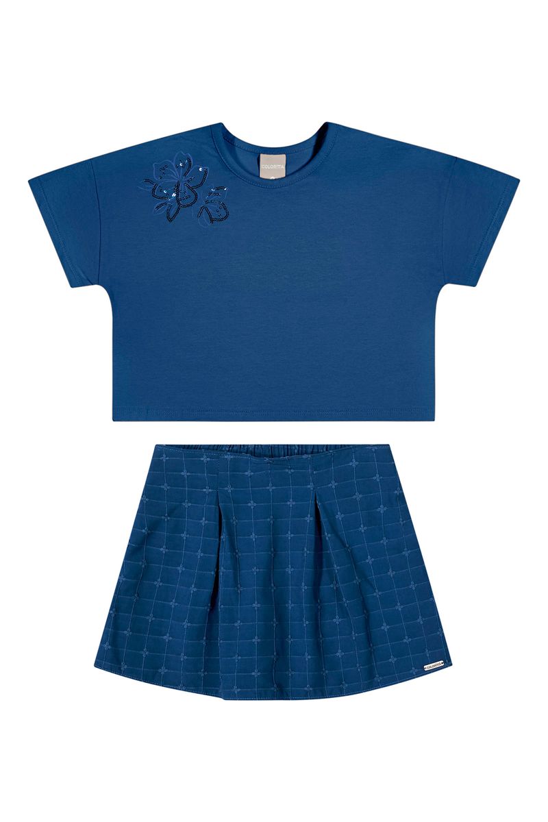 • Conjunto composto por blusa e short saia • Feito em cotton leve e tecido bordado • Modelagem cropped • Possui bordado floral com lantejoulas • Elástico no cós • Possui detalhe em pregas • Ideal para momentos especiais
