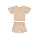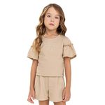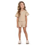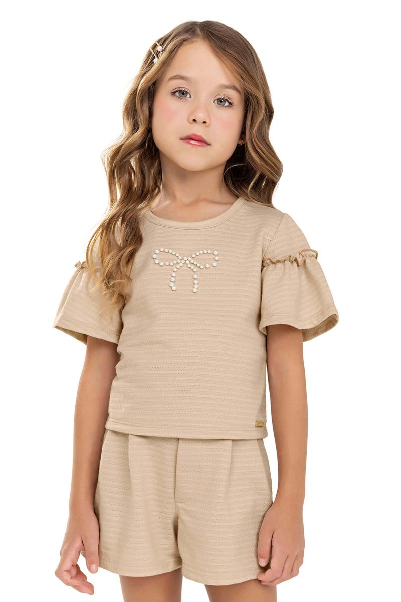 • Conjunto composto por blusa e short • Feito em malha texturizada • Possui mangas curtas amplas • Aplicação de pérolas em forma de laço • Elástico no cós • Ideal para passeios e momentos de lazer