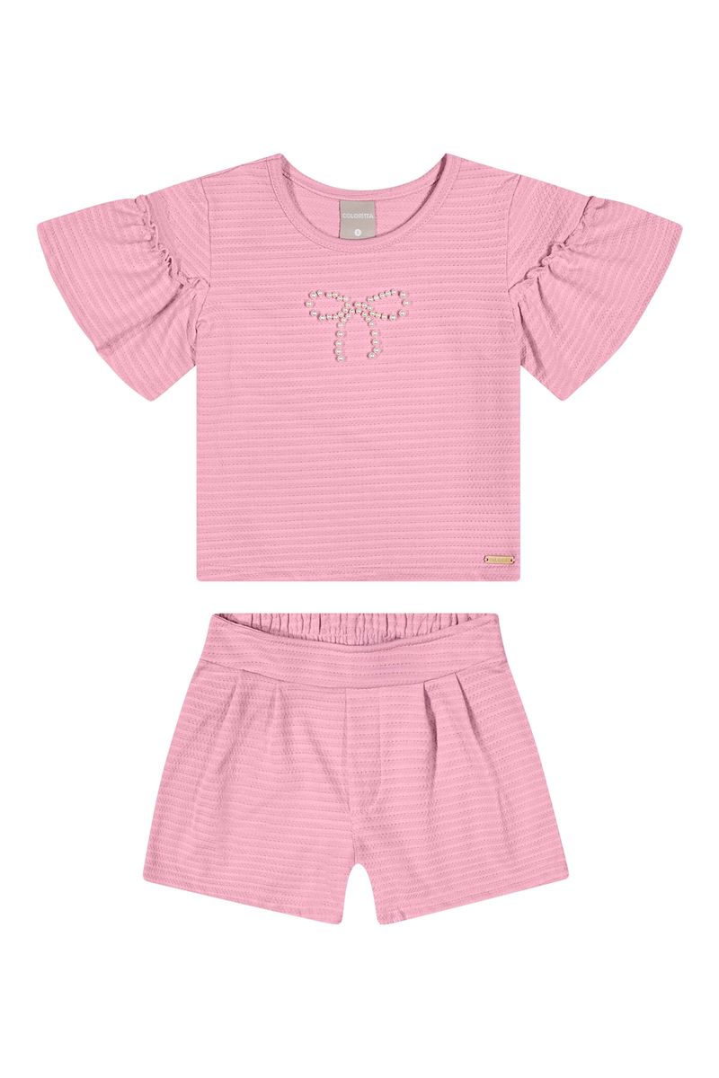 • Conjunto composto por blusa e short • Feito em malha texturizada • Possui mangas curtas amplas • Aplicação de pérolas em forma de laço • Elástico no cós • Ideal para passeios e momentos de lazer