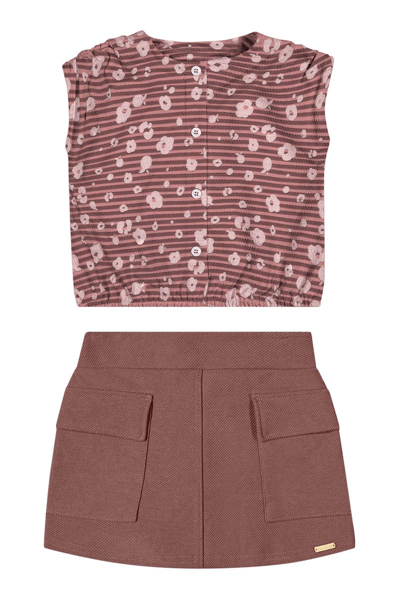 • Conjunto composto por blusa e short saia • Feito em malha texturizada e moletom sarjado • Possui modelagem muscle tee com ombros franzidos • Possui estampa floral com efeito "animal print" • Elástico no cós e barra • Possui bolsos • Ideal para ocasiões especiais