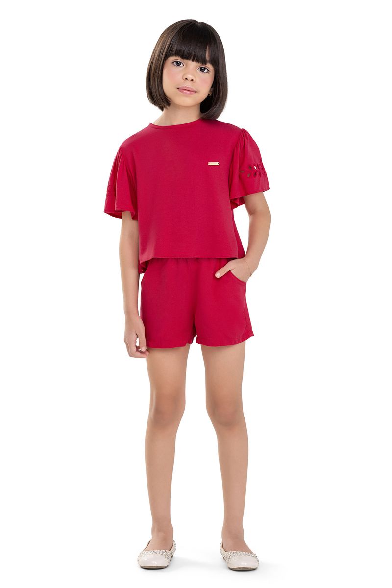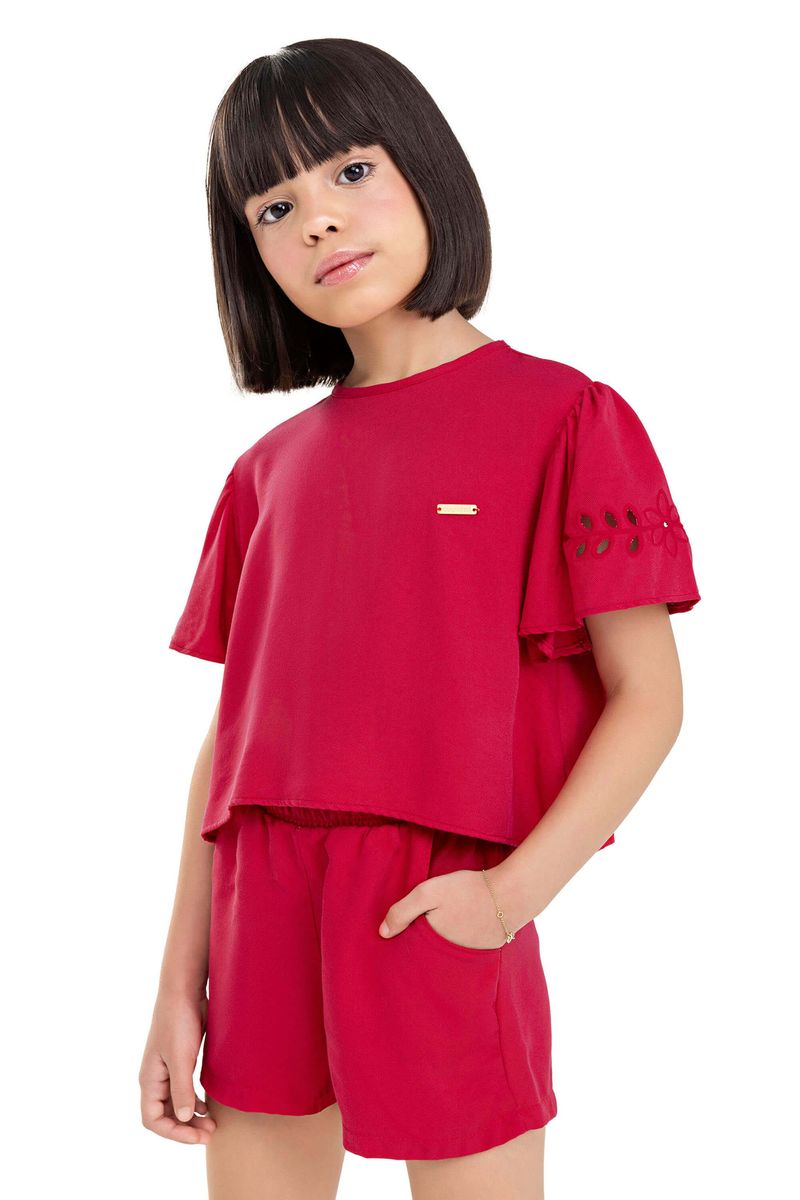 • Conjunto composto por blusa e short • Feito em tecido viscose sarjada • Modelagem soltinha • Mangas curtas amplas com bordados vazados • Elástico no cós • Possui bolsos • Ideal para ocasiões especiais