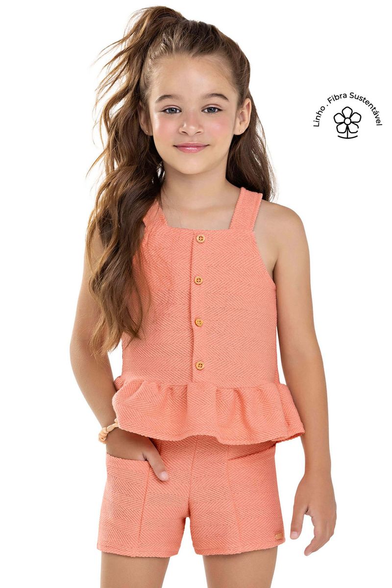• Conjunto composto por regata e short • Feito em malha tricô linho • Possui alças • Detalhe em babado e botões decorativos • Elástico no cós • Possui bolsos • Ideal para passeios e ocasiões especiais