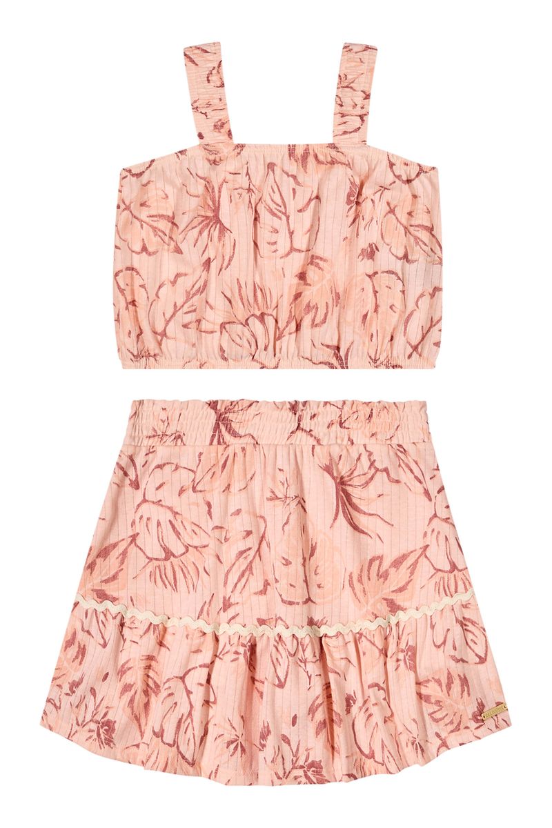 • Conjunto composto por regata e saia • Feito em malha canelada mesclada • Possui alças com elástico • Elástico no cós • Possui short interno • Estampa com folhagens tropicais • Ideal para passeios e momentos em família