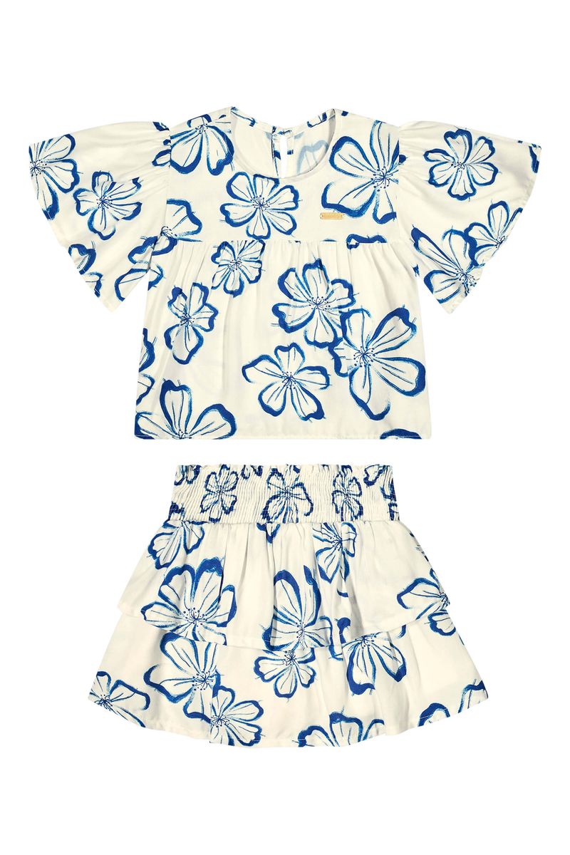 • Conjunto composto por blusa e saia • Feito em tecido viscose sarjada • Possui mangas curtas amplas • Estampa floral • Cintura mais alta com lastex • Possui short interno • Ideal para passeios
