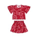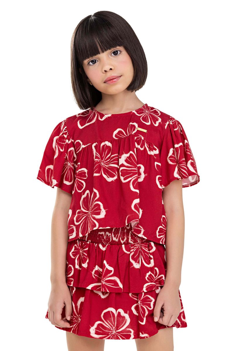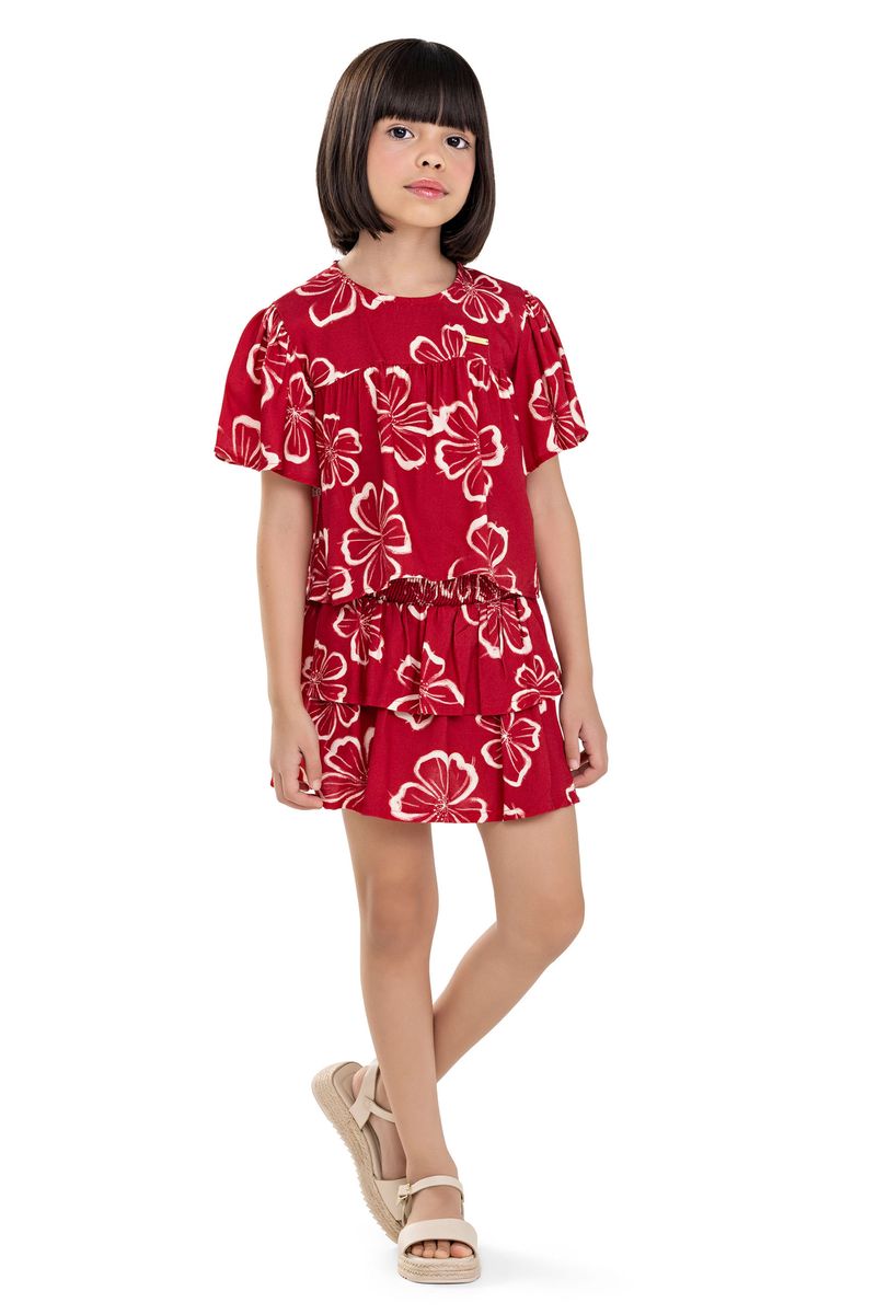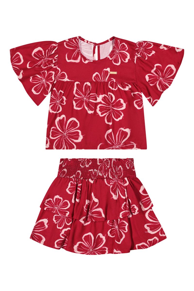 • Conjunto composto por blusa e saia • Feito em tecido viscose sarjada • Possui mangas curtas amplas • Estampa floral • Cintura mais alta com lastex • Possui short interno • Ideal para passeios