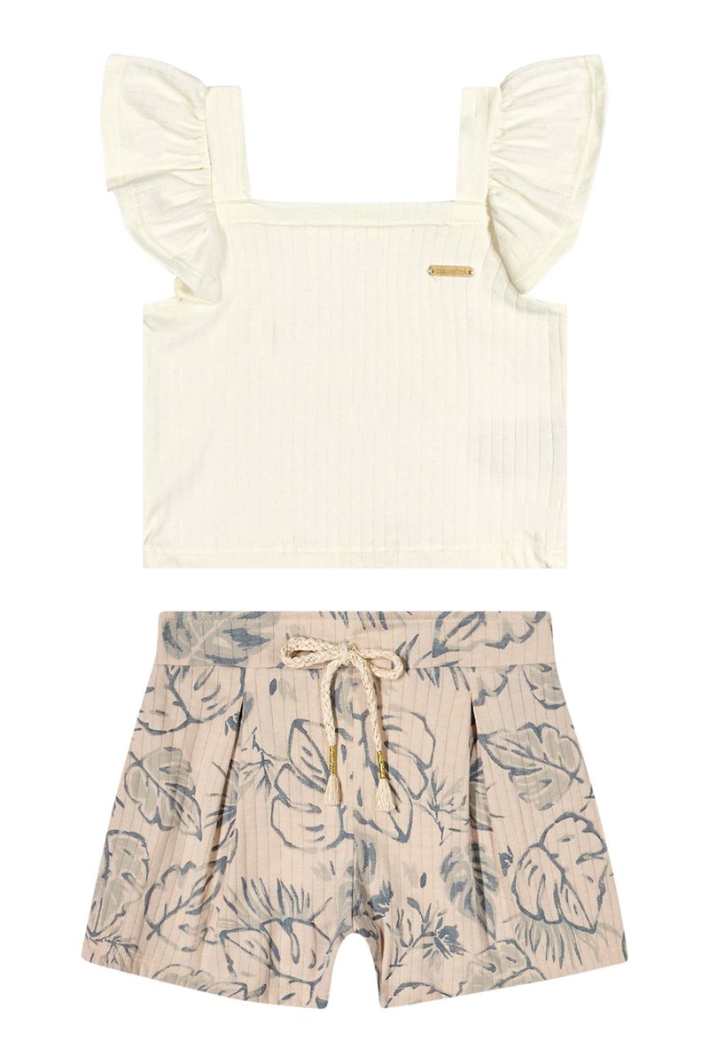 • Conjunto composto por blusa e short • Feito em malha canelada mesclada • Possui mangas curtas com babados • Elástico no cós • Estampa com folhagens tropicais • Ideal para momentos casuais com família e amigos