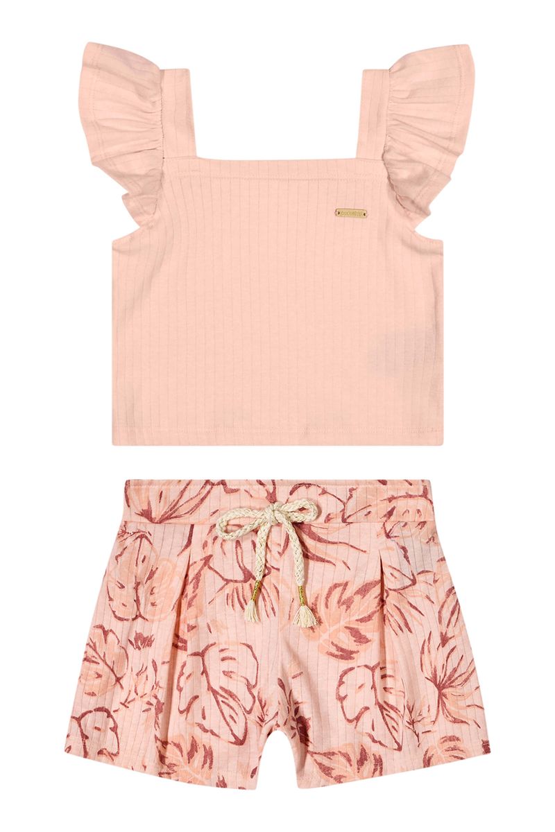 • Conjunto composto por blusa e short • Feito em malha canelada mesclada • Possui mangas curtas com babados • Elástico no cós • Estampa com folhagens tropicais • Ideal para momentos casuais com família e amigos