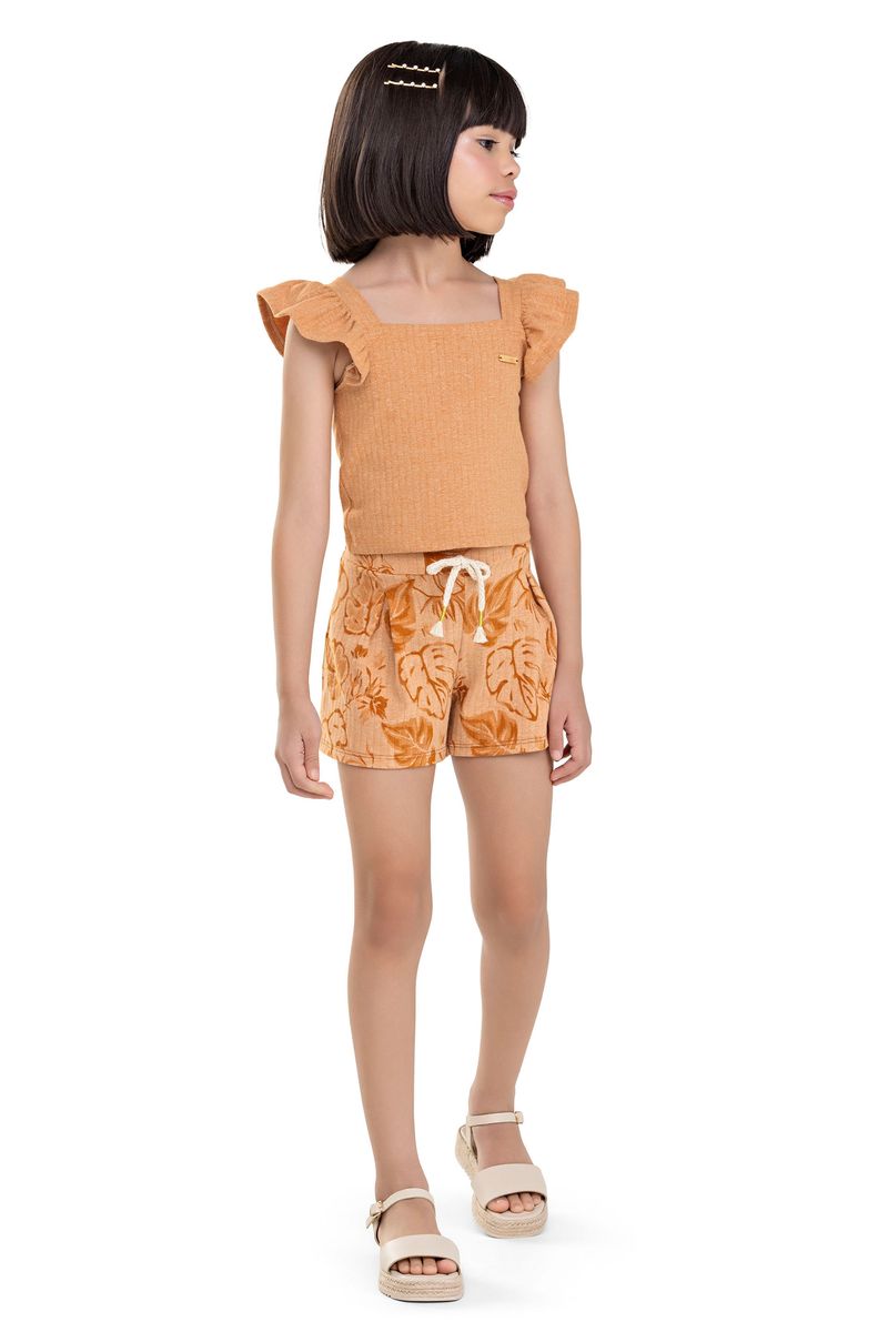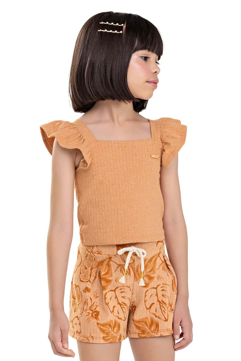 • Conjunto composto por blusa e short • Feito em malha canelada mesclada • Possui mangas curtas com babados • Elástico no cós • Estampa com folhagens tropicais • Ideal para momentos casuais com família e amigos