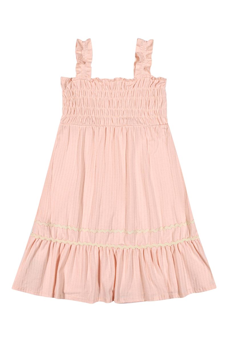 • Feito em malha canelada mesclada • Possui alças com elástico • Possui recorte com elástico no busto • Modelagem soltinha • Acabamento ondulado na saia • Ideal para ocasiões especiais e eventos em família