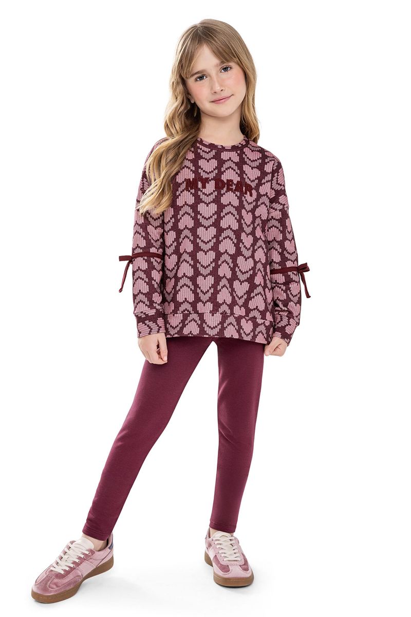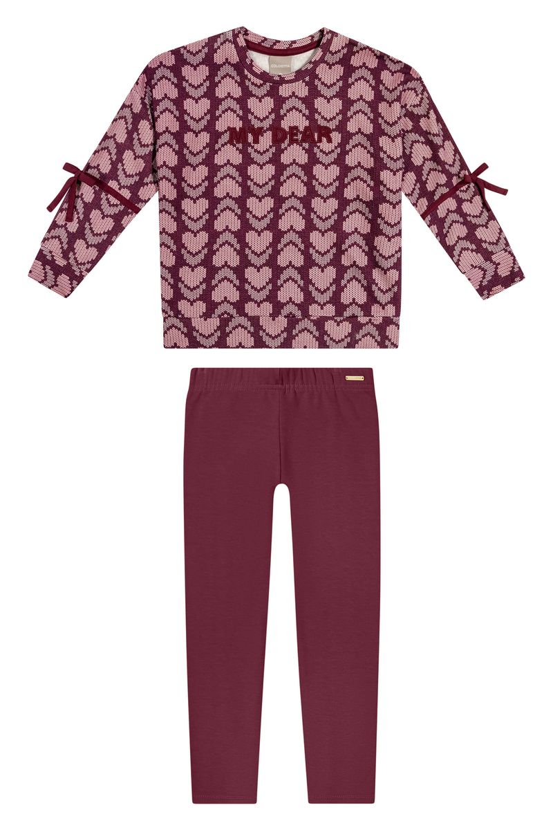 • Conjunto composto por blusão e legging • Feito em molecotton felpado • Possui mangas longas com detalhe em laço • Bordado frontal • Estampa de corações com efeito tricô • Elástico no cós • Ideal para passeios especiais