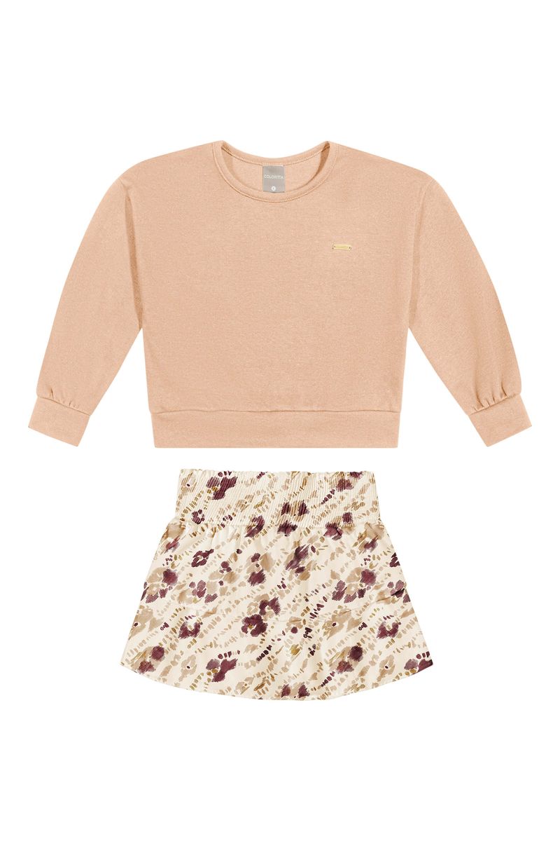 • Conjunto composto por blusão e saia • Feito em moletom ponto roma e viscose sarjada • Possui mangas longas com ombros deslocados • Elástico no cós em lastex • Com babados • Estampa floral abstrata • Possui short interno • Ideal para passeios e momentos especiais